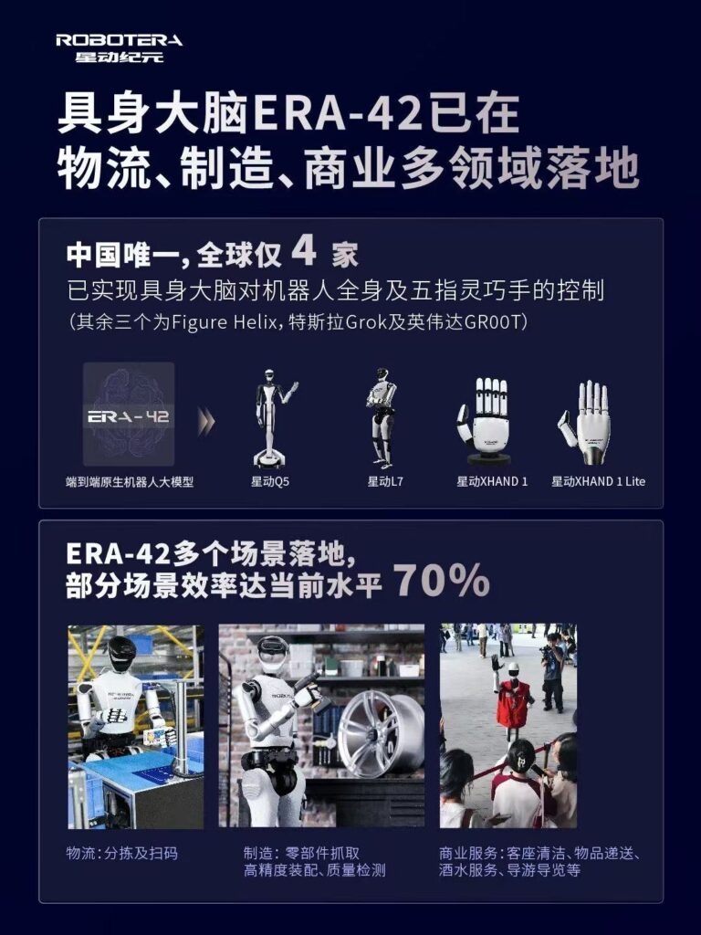 支撑“大脑”能力持续升级的核心,是星动纪元自研的端到端VLA具身模型ERA-42。ERA-42不仅形成一系列技术成果,引领全球具身模型范式,并在物流、制造、商业服务等多个领域落地,形成“场景越丰富,模型越智能”的正向循环。